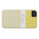Moderne gelbe, graue, weiße Zickzack und polka dot pattern i iPhone case. Ein stilvolles, elegantes, mädchenhaftes Design mit klassischen Zickzackstreifen und niedlichen Polka-Punkten mit zeitgemäßem, aber Vintagem Look. In der Mitte ist ein Rahmen. Sie können die Hintergrundfarbe ändern - Gelb und Textfarbe aus über 200 Farben aus dem Zazzle Farbdiagramm.