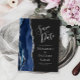 Diese elegante, moderne, Save the Date Postcard besticht durch eine marineblau-blaue Aquarellgrenze, die mit Imitaten bestickt ist, die mit silberfarbenem Glitzer verkleidet sind. Der anpassbare Text ist hellsilbergrau auf einem dunkelkohlegrauen Hintergrund. Die Rückseite wiederholt die Informationen zusammen mit einer anpassbaren Rücksendeadresse.