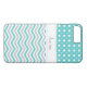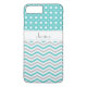Modernes Aqua, grau, weiß Zickzack und polka dot pattern iPhone 7 plus case. Ein stilvolles, elegantes, mädchenhaftes Design mit klassischen Zickzackstreifen und niedlichen Polka-Punkten mit zeitgemäßem, aber Vintagem Look. In der Mitte ist ein Rahmen. Sie können die Hintergrundfarbe - Türkis und Textfarbe aus über 200 Farben aus dem Zazzle Farbdiagramm ändern.