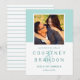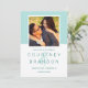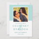 Moderne Hochzeit speichern die Datumskarten mit einem quadratischen Verlobung Foto gerahmt in Aqua / Minz blau grün mit einem einfachen und minimalistischen Stil Monogramm der Braut und Bräutigam mit einem eleganten Skript Ampersand. Personalisieren Sie den Save the Date Wortlaut mit dem Hochzeitsdatum und Ort. Auf der Rückseite der Karte befindet sich ein schlankes Muster aus aquamarinen, grünen und weißen Streifen.