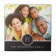 Diese elegante und moderne Kachel zeigt ein Bild einer Familie oder eines Paares im Hintergrund, einen Kreis mit einem Monogramm auf der Vorderseite und ein horizontales Banner auf der Unterseite, das den Familiennamen beinhaltet. Diese Kachel ist ein großartiges Geschenk für Familienfeiern, ein Paar, das verlobt oder verheiratet got, oder eine neue Zuhause.