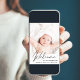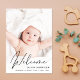 Eine moderne Karte, um die Geburt Ihres Babys anzukündigen, mit seinem oder ihrem Foto mit "Welcome", das oben in einer stilvollen Schrift steht. Fügen Sie unten seinen Namen, das Geburtsdatum und die Geburtsdaten hinzu. Fügen Sie auf der Rückseite drei zusätzliche Bilder und eine personalisierte Nachricht hinzu.