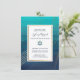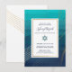 Diese moderne und elegante Bat Mitzvah oder Bar Mitzvah Einladung verfügt über goldene (simulierte Folie) Linien über einen aquamarinen und navy-ombre-Hintergrund (die sich leicht in jede beliebige Farbe ändern lassen). Ein Stern von David wird vorgestellt und entspricht den Goldlinien im Hintergrund. Passen Sie diese trendige Einladung mit dem Namen und Party-Info an.
