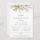 Elegante Aquarellblütenanordnung aus Elfenbein-Weiß, Pachelorange und zarte grüne Lilien und Blätter, Probe Dinner Einladung. Chic und modernes typografisches Design. Die Rückseite der Karte weist eine solide, dunkelgrüne Smaragdgrün-Farbe auf.