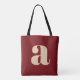 Eine kühle und stilvolle Totentasche mit tiefkirschrotem bordeauxrotem Hintergrund mit einem großen beigen Kleinbuchstaben in moderner Typografie. Ideal für den Alltag, Einkauf, Arbeit oder als Statement-Accessoire. Dieses zeitgenössische Design verbindet Minimalismus mit einer Retro-inspirierten Ästhetik und ist somit ein ideales Geschenk für Typografen und Trendsetter.