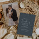 Dieses moderne schicke, dunkelmarineblaue Foto lädt zu einer Hochzeitsfeier ein. Das neutrale Boho-Design zeichnet sich durch eine einzigartige und stilvolle böhmische Typografie in minimalistischer dunkelblau-weißer Farbe aus. Personalisieren Sie den Rücken mit einem Verlobung-Foto.