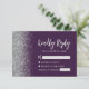 Der links Rand dieser eleganten, modernen Hochzeitsschutzkarte mit RSVP-Gehäuse weist einen silbernen Glitzer-Rahmen für Imitate auf. Der anpassbare Text kombiniert silbergraues Handschriftenskript und sans Serif-Schriftart auf einem dunklen lila Hintergrund. Die Rückseite ist lila und silber gehalten.