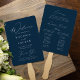 Eleganter Hochzeitsprogramm Handfan mit einem modernen weißen Kalligraphie-Skript mit marinischem Hintergrund, um ein Design zu schaffen, das perfekt für Hochzeiten aller Stile und Jahreszeiten ist. Personalisieren Sie die Front des modernen Hochzeitsprogramms mit Ihren Namen, Hochzeitstag und Ort, und individuelle Danksagung Nachricht. Der Fan des Hochzeitsprogramms kehrt zurück, um die Reihenfolge des Dienstes und eine Liste Ihrer Hochzeitsfeier anzuzeigen. Die Hochzeitsfeier wurde mit dem Handfan der Marine abgestimmt, um mit unserer Hochzeitskollektion "Moderne Elegance" abzustimmen.