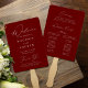 Eleganter Hochzeitsfan mit einem modernen weißen Kalligraphieskript mit bordeauxfarbenem Hintergrund, um ein Design zu schaffen, das perfekt für Hochzeiten aller Stile und Jahreszeiten geeignet ist. Personalisieren Sie die Front des modernen Hochzeitsprogramms mit Ihren Namen, Hochzeitstag und Ort, und individuelle Danksagung Nachricht. Der Fan des Hochzeitsprogramms kehrt zurück, um die Reihenfolge des Dienstes und eine Liste Ihrer Hochzeitsfeier anzuzeigen. Der bordeauxfarbene Hochzeitsfan wurde geschaffen, um sich mit unserer Hochzeitskollektion "Moderne Elegance" abzustimmen.