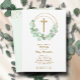 Elegante Taufeinladungen mit einem Glitzer-Kreuz aus goldenen Imitaten, einem Eukalyptusblattkranz und edlen Schriftzeichen auf der Vorderseite und goldenen Punkten auf hellgrün auf der Rückseite. Ideal für die erste Kommunion, Taufe oder Taufe Ihres Kindes. PASSENDE Artikel in unserem Shop erhältlich.