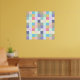 Es handelt sich um ein trendiges und stilvolles Design mit mehrfarbigen Quadraten, die in einem karierten Muster auf einem neutralen Gitterhintergrund angeordnet sind. Die Quadrate sind in verschiedenen Farben wie Blau, Grün, Rosa, lila, Gelb, Grau, Orange und Regenbogenpastelltönen gehalten und bilden ein einzigartiges geometrisches Schachbrettmuster.