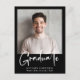 Moderne schwarze Abschluss Ansage Postkarte mit Ihrem Foto und "Graduate" in einem fett weißen Skript. Fügen Sie den Namen, Schule und Klasse Jahr in der einfachen weißen Typografie. Fügen Sie auf der Rückseite eine zusätzliche Foto und eine personalisierte Meldung hinzu, oder verließe Sie leer.