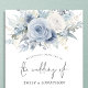 Moderne Florals QR Code Dusty Blue Wedding. Verfügbar in digitaler Form und gedruckt. Schöne sommerfarbene Blume in hellblau und weiß schmücken den oberen Rand. Mit einer koordinierenden dunkelblauen Farbe auf der Rückseite. Fügen Sie Ihren QR-Code zu Ihrer Hochzeitswebsite auf der Rückseite hinzu, damit Ihre Gäste alle Details online sehen können, ohne separate Gehäuse benötigen zu müssen. Eine informelle Set-Typografie in schwarz für die Hauptüberschrift der Hochzeit von Ergänzung der Erholung des Textes, die Sie leicht personalisieren können.