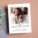 Einfache Ankündigung Datum freihalten Postkarte, die Ihr Foto mit einem quadratischen Rahmen ausgeschnitten und minimale moderne Typografie mit einer Touch eines eleganten Drehbuchs. Personalisieren Sie mit Ihren Vornamen, Hochzeitsdatum und Ort. Auf der Rückseite passen Sie Ihre Save the Date-Details an und fügen Sie Ihre Namen in ein signaturähnliches Skript ein.