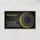 © Persönlichkeit des öffentlichen Lebens-Entwürfe 2012. Moderne Fotograf-Visitenkarte mit gelbem Fensterladenentwurf und Goldtext. Das Fensterladenentwurfselement kann auf der Visitenkarte verschoben werden und die Größe neu bestimmt werden. Wählen Sie eine andere Hintergrundfarb- und -Schriftartart zum Anzug Ihr Geschäft.