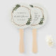 Moderner Boho Brautparty Handfan mit Ihrem Namen, Veranstaltungstitel und Datum in einem goldgeometrischen Rahmen umgeben von Grün und weißen Blume. Die Rückseite hat Ihr persönliches Dankeschön Nachricht im gleichen geometrischen Rahmen. Ein botanisches Design, das sich perfekt für eine böhmische Feier im Sommer eignet. Rahmen mit freundlicher Genehmigung von:<a href="http://www.freepik.com">von Freepik</a>