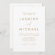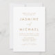 Einfache und elegante Einladungen für eine Hochzeit mit einem goldenen, handgeschriebenen Drehbuch, kombiniert mit einer modernen Schrift mit weißem Hintergrund. Personalisieren Sie die Front der minimalistischen Hochzeitseinladung mit Ihrem Namen und Ihre Hochzeitsdetails. Personalisieren Sie die Rückseite der Einladung mit Hochzeitsdetails wie Empfang-Informationen, Hotel-Unterkünfte, UAWG-Instruktionen und Hochzeitswebsite. Fügen Sie Ihren Wunschwebseiten-Link in die beiliegende QR-Code-Vorlage ein, damit Ihre Gäste ganz einfach online UAWG und weitere Hochzeitsinformationen erhalten. Die goldenen Einladungen für Hochzeiten sind die perfekte Wahl für moderne Hochzeiten.