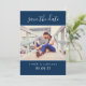 Einfach stilvolle zweiseitige Hochzeitsfeier speichern Sie die Datumskarten mit zwei Verlobungen Fotos und modernem, individuellem Text. Personalisieren Sie die Kartenvorlagenformulierung auf der Vorder- und Rückseite der Karte für Ihren großen Tag. Der marineblau Hintergrund und die weiße Textfarbe können auf Ihr Hochzeitsfarbschema abgestimmt werden.