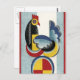 Eine Art-Déco-abstrakte Version eines Hühners, das auf einem Ei sitzt. rot, blau und gelb