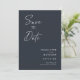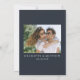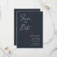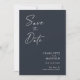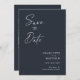 Moderne, minimalistische und elegante "Save the Date" Hochzeitsfotokarten der Verlobung. Dieses individuelle Design mit Elementen des modernen Textes mit einem einzigartigen kalligraphischen Tintenskript. Das Foto für Paare hebt die Rückseite der Karte hervor. Die Farben sind weiß und auf Schieferblau geschrieben oder passen die Grundfarbe nach Bedarf einfach an.