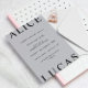 Unsere Kollektion "Ultra Modern Wedding" beinhaltet überdimensionierte Monogramme in einem Serif-Schriftart, die oben und unten überlaufen und mit einem modernen Script für alle weiteren Informationen gepaart sind. Sie können zwischen verschiedenen Hintergrund- und Schriftart-Farben wählen und die Produkte einfach anpassen. Karo in unserem Shop für weitere Artikel aus dieser Kollektion.