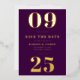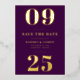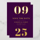 Modernes Save the Date mit Ihrem numerischen Hochzeitstermin in fett-goldfarbenen Lettern mit dunklem lila Hintergrund. Personalisieren Sie die dunkle lila und Goldfolie Save the Date, indem Sie Ihre Namen, das Hochzeitdatum und den Hochzeitsort hinzufügen.