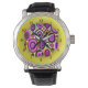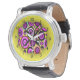 Sehr einfaches, modernes Retromuster mit runden Formen in Rosa, Orange, lila und Weiß auf neongelbem Hintergrund. Erstellt in ArtRage 3 Studio Pro, mit Schablonen und Schichten, von Gina Lee Manley ©gleem Sie wählen den Stil der Uhr und Farbe der Armband.