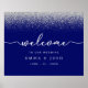 Dieses moderne Begrüßungsschild mit Imitaten aus Silber-Glitzer mit weißen Schriftart auf einem reichhaltigen königsblauen Hintergrund. Dieses Begrüßungszeichen ist Teil einer passenden Hochzeitssuite, die vollständig personalisiert sein kann.