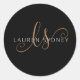 Modernes Black Gold Feminine Script Mit Monogramm Rundaufkleber. Dieser moderne, elegante Aufkleber lässt sich einfach mit Ihrem individuellen Monogramm und Namen personalisieren.