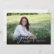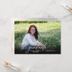 Diese moderne Graduiertenparty lädt mit einem horizontalen Foto, das die gesamte Kartenvorderseite und ein zweites verblasstes Foto auf der Rückseite ausfüllt, zum Abschluss ein. Moderne Handschrift erscheint über dem Foto, dass '25 Graduierte liest. Benutzerdefinierter Text erlaubt es, den Namen und die Schule des Absolventen auf der Vorderseite und die Party Einladung auf der Rückseite hinzuzufügen.