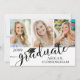 Moderne Collage Abschluss-Ankündigung mit 3 Fotos auf der Vorderseite und 1 auf der Rückseite mit Kalligraphie-Schrift-Typografie für den Titel GRADUATE mit einem Graduierungsdeckel oder Mortarboard und personalisiert mit dem Namen und Klassenjahr Ihres Absolventen in schwarz auf einem bearbeitbaren weißen Hintergrund - wählen Sie eine andere Farbe oder wählen Sie aus einer Vielzahl von Styling-Grafik-Hintergründen. Auf der Rückseite finden Sie Details zu Ihrem Absolventen. HILFE: Für Hilfe bei der Modifikation/Personalisierung des Designs, bei Farbänderungen, bei der Übertragung des Designs auf ein anderes Produkt oder wenn Sie die Dinge koordinieren möchten, wenden Sie sich bitte an den Designer, BEVOR Sie über Zazzle Chat oder makeitaboutyoustore@gmail.com bestellen.