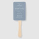 Dieses moderne Hochzeitsprogramm-Fan verfügt über weiße Skripte und sans Serif-Text auf einem staubigen blauen Hintergrund.