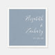 Diese einfachen, modernen Hochzeitsnapkins sind mit weißem Text versehen, der auf einem staubblauen Hintergrund am rechten Rand ausgerichtet ist. Fügen Sie die Namen der Braut und des Bräutigams in stilvoller Handschrift Kalligraphie hinzu.