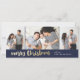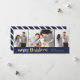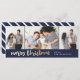 Eine festliche Fotokarte mit goldener Weihnachtsschrift mit drei Fotos und einem marineblauen Hintergrund.