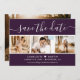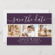 Elegante lila Hochzeitskarte Save the Date mit einem modernen Script-Schriftart und einer Foto-Collage. Sie können diese Karte ganz einfach mit Ihren Bildern und Hochzeitsdetails personalisieren, ggf. auch mit einer Hochzeitswebsite.