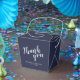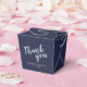 Moderne Script Navy Blue Gastgeschenk Hochzeit Geschenkboxen mit dem Wort 'Danke' in weißem, modernem Script Schriftart mit Namen und Datum in modernen Sans Serif Schriftart auf marineblau Hintergrund.