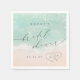 Schöne türkisfarbene abstrakte Aquarell glitzernde Ozeanwelle und Herzen im Hintergrund des Sandstrandes, mit stilvollem Drehbuch und eleganten Serif-Schriftart, modern und einfach. Große Servietten für Hochzeitsdusche am Strand, tropische Hochzeit in Urlaubsort, Brautparty zum Thema Meeresküste im Sommer.