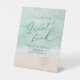 Schöne türkisfarbene abstrakte Aquarell glitzernde Ozeanwelle und Herzen im Hintergrund des Sandstrandes, mit stilvollem Drehbuch und eleganten Serif-Schriftart, modern und einfach. Große Hochzeitsgast-Buchschild für nautisches Brautparty, tropische Hochzeit in Urlaubsort, Party zum Thema Meeresküste.