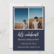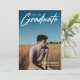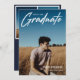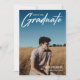 Modernes White Script "Graduate" Overlay, Ankündigung und Einladung von Foto Abschluss der Senior Class. Vorlagenzeilen für den Namen des Absolventen, die Klasse des Jahres und die Schule. Auf der Rückseite der Karte befinden sich 2 zusätzliche Fotos mit Textzeilen für die Details Ihrer offenen Haus/Graduierungsparty auf marineblau blauem Hintergrund.
