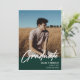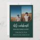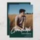 Modernes, weißes Skript "Graduate" Overlay, Ankündigung des Abschlusses der Senior Class und Einladung in grün. Vorlagenzeilen für den Namen des Absolventen, die Klasse des Jahres und die Schule. Auf der Rückseite der Karte befinden sich 2 zusätzliche Fotos mit Textzeilen für die Details Ihrer offenen Haus/Graduierungsparty.