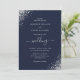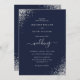 Elegante Hochzeitseinladungen in Blau und Silber mit silberfarbenem Glitzer auf marinebasischem Hintergrund. Chic Hochzeitseinladungen mit modernem Drehbuch perfekt für eine elegante, luxuriöse marineblaue und silberne Hochzeit.
