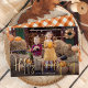 Niedliche Erntedank-Fotokarte mit "Happy Thanksgiving", die in einem handgeschriebenen, handgeschriebenen Skript-Overlay aus Goldfolie dargestellt ist. Personalisieren Sie die Karte mit Ihrem bevorzugten horizontalen Foto und Ihrem Familiennamen in weißer Schrift. Die Karte zeigt einen karierten Hintergrund in Creme und Orange an.
