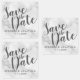 Modernes Script Save the Date Labels mit dem Titel "Save the Date" in grauem, modernem Script-Schriftart mit Namen und Datum in modernen Sans Serif Schriftart auf weißem Marmorhintergrund.