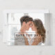 Modernes Typografie-Foto Ankündigung Datum freihalten mit einem sauberen und modernen Text-Box-Design in schwarz. Fügen Sie ein Foto und Ihre Hochzeitsdetails zu anpassen. Hintergrundfarbe auf der Rückseite der Einladung kann geändert werden, um das Foto zu ergänzen oder Ihre Hochzeitsfarbe hinzuzufügen. Ideal für die Paare, die ein minimalistisches Design für ihre Hochzeitsankündigung will.