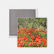 Ein quadratischer Foto-Magnet mit einem Feld mit roten Mohn-Blume unter alten Olivenbäumen in einem Obstgarten im Grünen Italiens im Sommer.