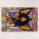 Afrikanisch-amerikanische Fee mit lila Schmetterlingsflügeln aus Monarch. Farbenvolles, geometrisches Design und florentfarbenes Glas keltischer Knoten funktionieren rund um die Fee.