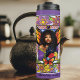 Afrikanisch-amerikanische Fee mit lila Monarchen-Schmetterlingsflügeln. Farbenfrohe Blumen und keltische Knoten arbeiten Design rund um die Fee.