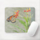 Ein orangefarbener und schwarzer Monarchen-Schmetterling sickert Nektar aus einer tropischen Milkweed-Blüte. Auf der gleichen Pflanze, eine Monarch-Raupe, isst die Blätter ihrer bevorzugten Host-Pflanze.