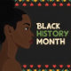 Eine junge Afroamerikanerin mit dunkler Haut, lockigen Haaren und einem ernsten Ausdruck vor schwarzem Hintergrund mit farbenfrohen geometrischen Mustern und dem "Text" Black History Month
