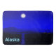 Moonrise in der Innenstadt von Alaska. Berge in der Ferne und ein Fischerboot fährt nach Norden. Der Text "Alaska" erscheint in leuchtendem Blau und Weiß.
